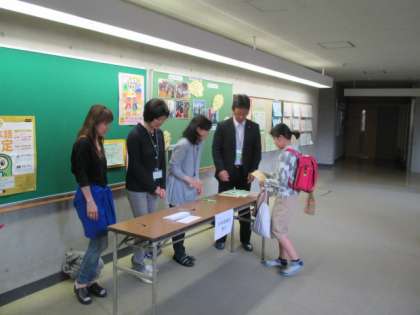 6月12日(金)に行われる、学校運営委員会主催の「日本語検定」の申し込みが行われています。朝の登校の時間帯に、運営委員会やPTAの方々にご協力をいただき、申し込み書の受け付けをしていただいています。たくさんの申し込みを待っています。チャレンジしてくださいね。