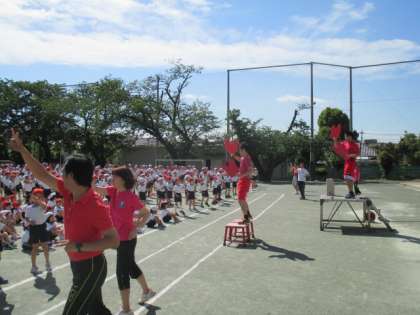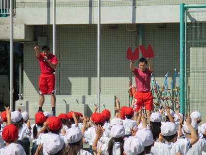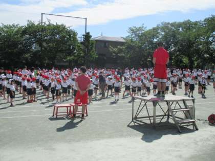 今月の体育朝会は、全校で行う準備運動として、『エビカニクス』を踊りました。1年生は初めてだったので、まずはお兄さん、お姉さんの見本を見ます。真っ赤な服を着て模範演技をする担当教員もノリノリで踊り、大盛り上がり。でも、1年生はとても覚えがよく、見よう見まねで身体が動き、2回目にはみんなと同じように踊ることができました。