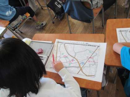 3年2組では、先日の地域廻りのまとめとして、訪れた場所を地図に書き込んで整理しました。学校やお寺などの地図記号を教わり、自分の地図に書き込みます。消防署の地図記号では、元となった「さすまた」が登場し、先生の説明をみんな真剣に聞いていました。