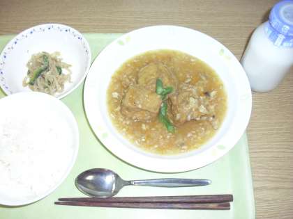 「ごはん、厚揚げのそぼろあんかけ、ごま酢かけ、牛乳」です。