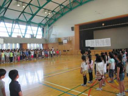今月の「毎月の歌」は、『ビリーブ』です。給食の時間に流れ、各クラスでも音楽の授業で練習してきました。今朝もいつものように、8時30分には全員そろって始めることができました。1年生もしっかり歌詞を覚えて歌うことができ、1回で本澤先生から合格をもらえたので、特別ゲストの「ガチャガチャバンド」が特別出演で登場することになりました。そのメンバーは、予想通り、八幡山小の先生たち。校長先生と石井先生のギター、坪木先生のバイオリンなど、先生たちはいつ練習していたのでしょうか。子どもたちも、先生たちに負けないくらい、演奏に合わせて元気に歌っていました。