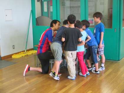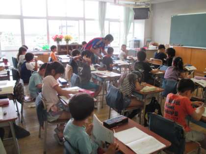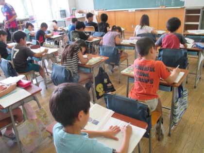 3年1組では、国語で説明文の読解の授業が行われていました。教科書の『米と麦』の文章をまとまりに気をつけて読み、段落ごとに書かれていることを整理してまとめます。楽しみながら読む物語のような文章と違って、段落相互のつながりを考えて読むのは、なかなか根気のいる作業です。担任の坪木先生は、じっくり考えている子に対しても、個別にていねいに対応し、時には小集団にして説明を繰り返すなど、きめ細やかな指導をしていました。