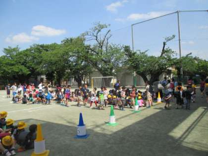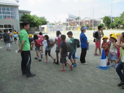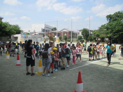 大型台風の接近や、大雨、大雪の影響で個別での下校が困難な時などの際に、同じ方面の子どもたちが、安全に下校するための訓練として行います。地区班での活動が終了した後、そのまま班長を中心にして校庭に集合し、集団で下校しました。担当の先生や保護者の方々に見守られて、通学路の歩き方や安全を確認しながらの下校になりました。
