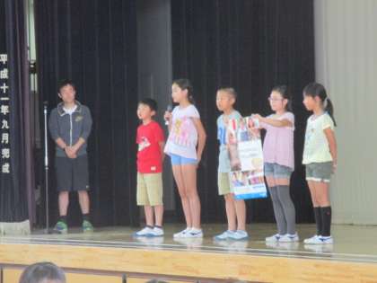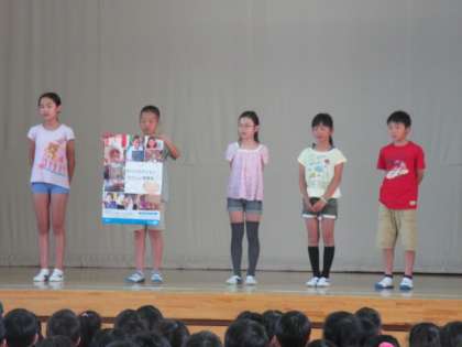 全校朝会の校長先生のお話の後、代表委員会の児童が、ユニセフ募金への協力について、全校児童に呼びかけました。明日から29日(金)まで、代表委員の児童が、朝の登校時と休み時間に募金箱をもって回ります。ご協力お願いします。