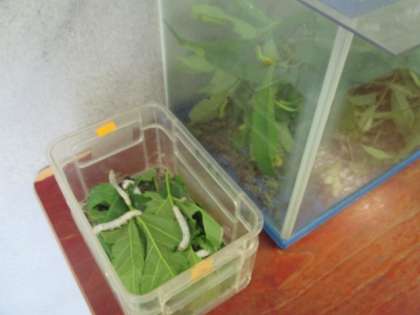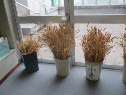 3階の5年生のフロアには、授業で使ういろいろな教材が展示してあります。5年生の総合的な学習の時間で扱っている蚕や、社会科の授業で出てくる小麦など、子どもたちが実際に見たことや触れたことのないものを、担任が準備しています。実物に触れることで、自分たちの学習課題に関心を深めてくれることを期待しています。