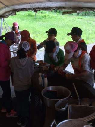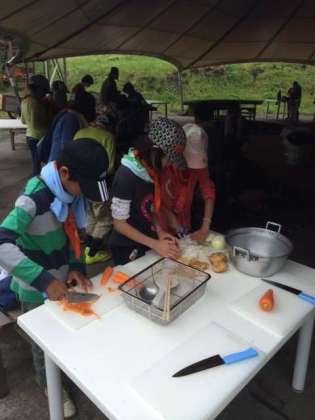 カレー作りの始まりです。説明を聞いて元気よく返事をしたものの、手元はいささか不安気ですが、果たして無事完成するのか…。