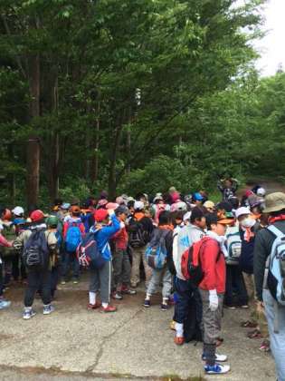 ハイキングのスタート地点に来ました。ここからハイキングの始まりです。グループごとに力を合わせて歩きます。目標タイムは3時間。ピッタリ賞は出るのでしょうか?