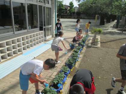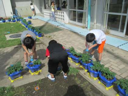 2年生は、生活科でミニトマトの栽培をしています。今日も朝から水やりをして、どの子も一生懸命お世話をしていました。初夏の日差しを浴びて、早く赤い実がついてくれるといいですね。