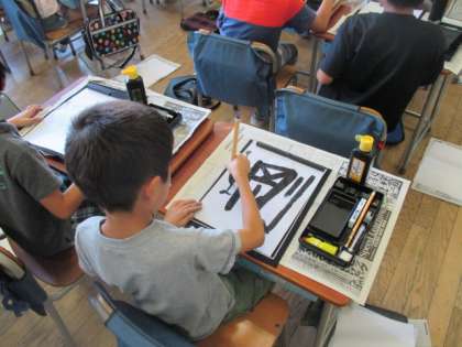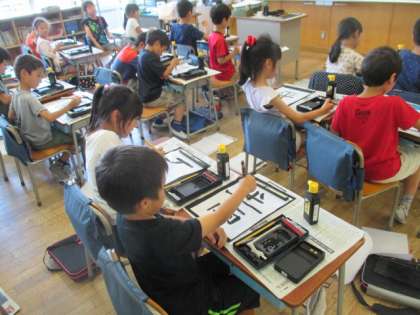 3年生は、初の習字の授業です。習字道具の準備の仕方から、筆の持ち方を一つひとつ丁寧に教わって、いよいよ墨をつけて書きます。鉛筆と違って力加減が難しいようで、苦労している子もいましたが、初めて書いた字にみんな満足そうでした。使った筆などは、お家できちんと手入れしておいてくださいね。
