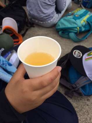 関りんご園に到着。りんごジュースをいただきます。「今まで飲んだりんごジュースの中で一番おいしい??」そうです。りんご栽培についてお話をうかがいます。