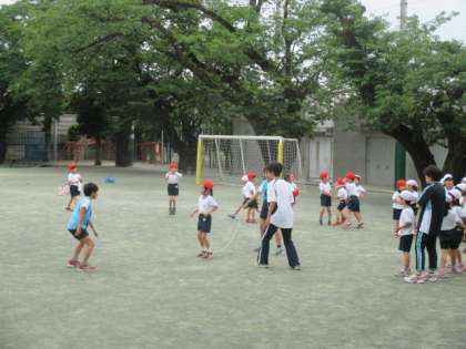 今日も中休みは、金スポです。全員校庭に出て、クラスで長なわに挑戦しています。1年生も、6年生のお兄さんやお姉さんに手伝ってもらってがんばっていました。クラスのまとまりもでき、記録もどんどん伸びているようです。