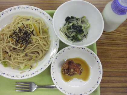 「和風スパゲティ、鶏肉のレモンソース、和風サラダ、牛乳」です。