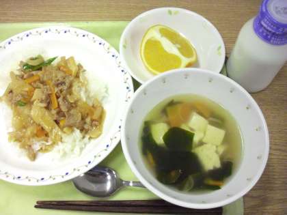 「スタミナ丼、わかめスープ、甘夏みかん、牛乳」です。