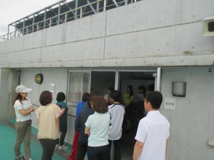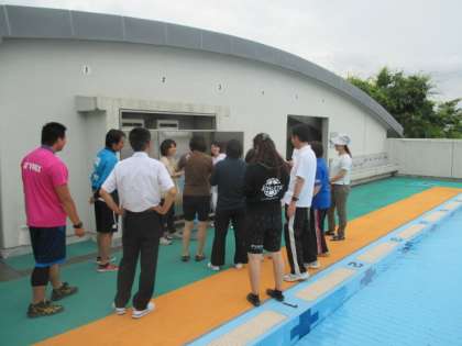 今週から始める水泳指導に向けて、放課後先生たちが集まり、プールの施設の案内や機械の使い方などの研修を行いました。本校のプールは、可動床で水位を調節します。操作ほ方法や薬剤の扱い方など、今年からいらした先生方は熱心に説明を聞いていました。安全に指導が行えるようにするために、先生方も準備をしています。