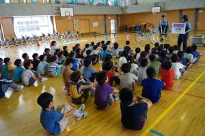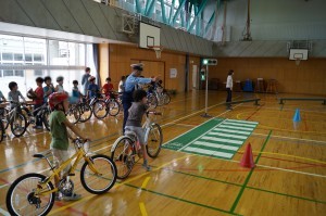 1年生に引き続き、3年生も交通安全教室です。家から持ってきた自分の自転車を使って、正しい自転車の操作の仕方と、安全な乗り方を学びました。体育館の跳び箱を使って死角を作ったり、横断報道を用意していただいたりして、自分の自転車で練習します。いつもとは違い雰囲気の中で、思うようにいかずに悪戦苦闘していましたが、みんなといっしょに勉強したことで、とても楽しい時間になったようです。3年生も交通ルールを守って、正しく安全に自転車に乗ってください。