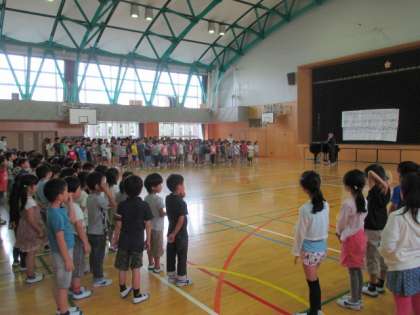 今朝の音楽朝会は、『小鳥のカノン』という歌を、6年生から順番に輪唱(カノン)で歌いました。歌い出しのタイミングをそろえるのがとても難しく、指揮(合図)をよく見る必要があります。短い時間でしたが練習を重ね、最後は全員で合わせることができました。きれいな小鳥の声が、体育館にこだましました。