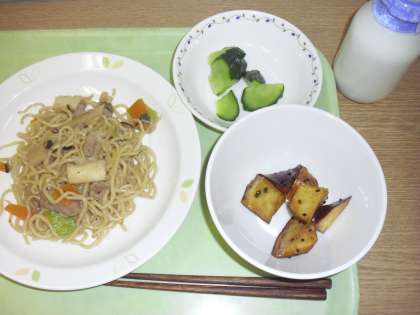 「五目焼きそば、大学芋、きゅうりの甘酢かけ、牛乳」です。