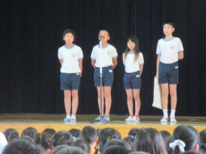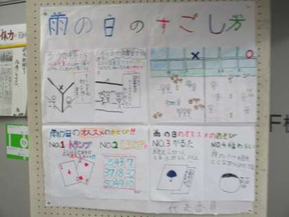 今日の全校朝会で、代表委員より全校児童に向けての発表がありました。梅雨の時期、雨の日が多くなることにより、教室や廊下を走ったり、騒いだりすることがないようにと、代表委員の人たちが話し合っての提案でした。雨の日の過ごし方として、おすすめの遊びを紹介したり、部屋での過ごし方をポスターにして掲示したりといった活動です。雨の日でも、みんなで楽しく学校生活を送れるようにと代表委員の人たちが考え、自ら進んで取り組もうとしています。雨の日には、ぜひ、全校で実践していってほしいですね。
