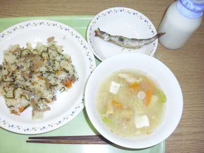 「豚肉とごぼうのごはん、焼きししゃも、味噌汁、牛乳」です。