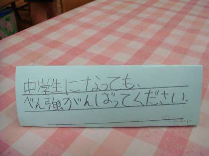 テーブルの上には、2年生手作りの6年生の名札。名前の面の反対側には感謝とエールの言葉が書かれていました。うれしいですね。