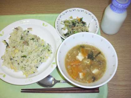 「青菜のチャーハン、麻婆汁、ナムル、牛乳」です。
