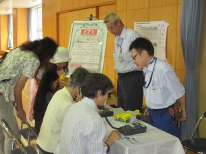 避難所運営委員は4つの組織に分かれ、それぞれ訓練に入ります。総務・情報担当は、施設の安全確認の後、避難者の受け入れ準備や臨時電話設営などの作業等を行いました。電話会社の協力を得て、体育館に臨時電話が設営され、災害時の通信手段について学びました。
