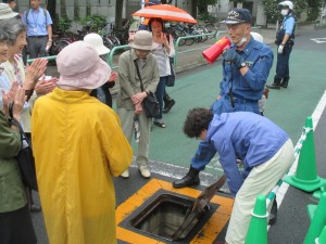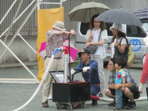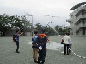 一般参加者の方々には、さまざまな体験型プログラムに参加しました。スタンドパイプによる放水の訓練では、消防署の方から詳しい説明をいただき、マンホールの開け方やホースのつなぎ方等を体験しました。運営委員や地域の方々は、万一に備えて意欲的に訓練に参加され、校庭に勢いよく放水されました。自分の町は自分たちで守るという意識のあらわれだと思います。