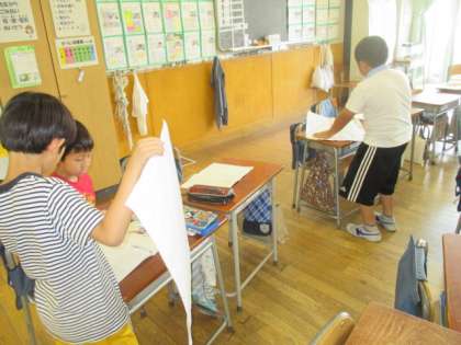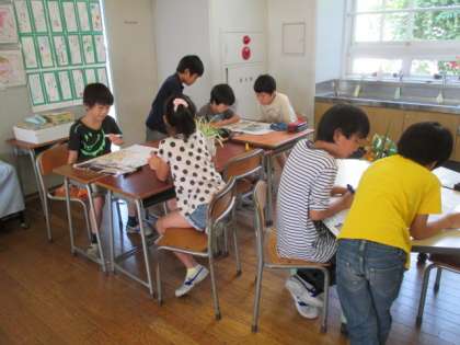 3年生は、総合的な学習の時間で、八幡山小や駅周辺の施設やお店を調べ、紹介する新聞作りをしています。2組では、それぞれのグループで調べたり、取材したりしたことを整理しながら、まとめの作業に入っていました。みんなのお気に入りの場所やお店など、どんなところが登場するのか、とても楽しみです。
