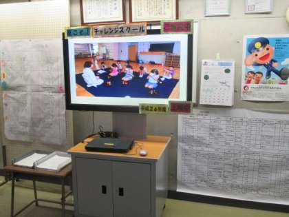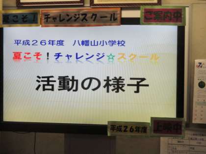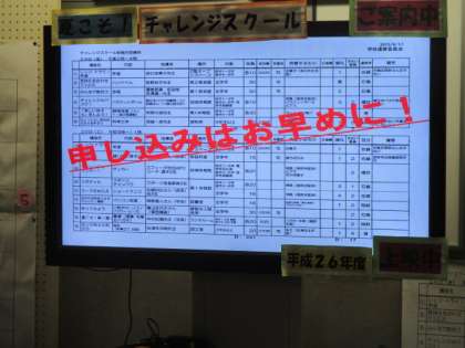保護者会に参加していただいた保護者に向けて、今日と昨日の2日間、玄関先で、昨年度のチャレンジ☆スクールの様子をモニターでご案内しました。いよいよ来週の月曜日が申し込みのしめ切りになります。たくさんの申し込みをお待ちしています。