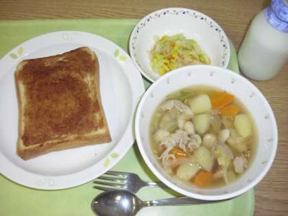 「シナモントースト、白いんげん豆の田舎風スープ、コーンサラダ、牛乳」です。
