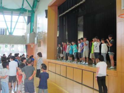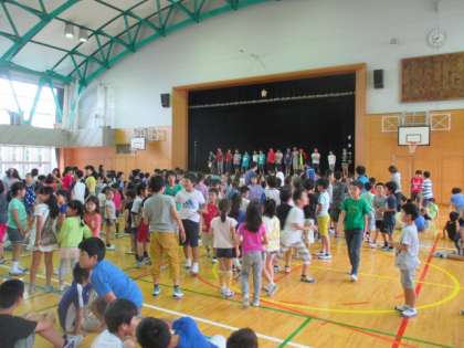 1学期最後の児童集会は、前日の「七夕」にちなんで、『猛獣狩りゲーム〜七夕バージョン』を体育館で行いました。集会委員の児童が、「七夕」に関係する言葉をお題として出します。その言葉の数の人数が声をかけ合って集まり、グループを作る活動です。「ひこぼし」、「ねがいごと」など、4文字や5文字になると、メンバーが入れ替わり、いろいろな友だちと関わることができます。時間いっぱい何度も繰り返し、体育館に楽しい声が響き渡りました。集会委員のみなさん、ご苦労様でした。2学期も楽しい集会を企画してくださいね。
