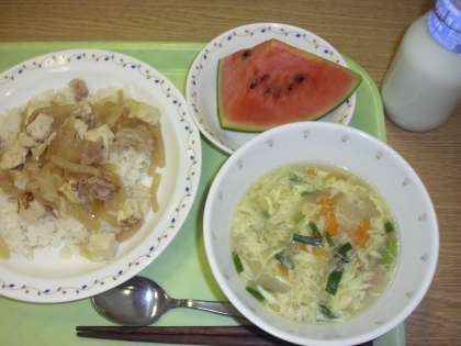 「豚丼、にらたまスープ、小玉すいか、牛乳」です。