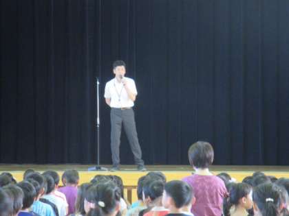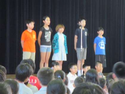 1学期最後の週の全校朝会です。校長先生からは交通安全についてのお話がありました。最近自転車での事故が増えていることや、子どもでも自転車に乗って人を怪我させた場合は、重い責任を負うことになることなど、夏休みに向けても気をつけていかなければいけない話題でした。看護当番の先生からは、計画的に荷物を持ち帰ることについて、何人かの先生に寸劇をしてもらって説明しました。代表委員からは、先日参加した学び舎の児童会生徒会交流会の報告と、あいさつキャンペーンの案内がありました。残り1週間ですが、楽しい夏休みを迎えるために、気を引き締めていきましょう。