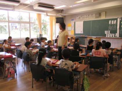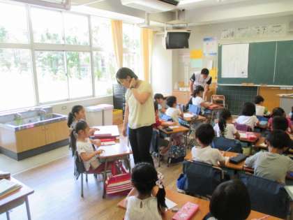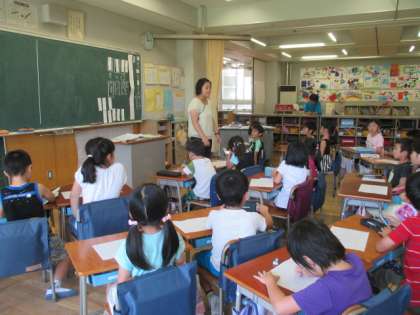 1年2組の根岸教諭は、初任者研修の一環として研究授業を行いました。3時間目の国語の授業で、助詞「は」「へ」「を」の使い方の指導でした。先生の指示に従って、みんなで正しく音読したり、ワークシートに文を書いたりして、子どもたちは一生懸命に授業に臨む姿が見られました。根岸教諭も授業の準備を綿密に行い、授業の展開を考えてスムーズに進めることができていました。放課後の協議会では、参観した先生方から指導をいただいたり、激励やお褒めの言葉もいただき、さらに2学期に向けて決意もあらたにしたようです。今後も学校全体で、1年2組の子どもたちと根岸教諭を見守っていきたいと思います。