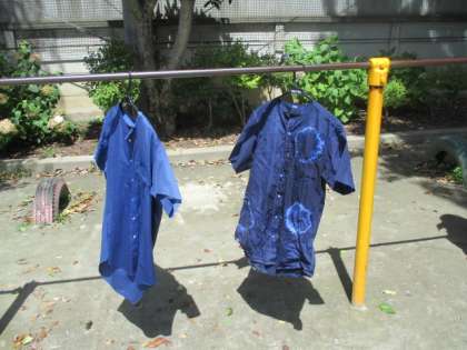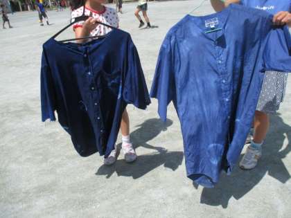 校庭の鉄棒などに干したシャツは、夏の陽ざしに浴びて数時間で乾きました。どれ一つとして同じようには染まらず、それぞれが独自の味わいのある仕上がりになっていました。子どもたちもうれしそうに教室に持ち帰っていました。運動会の晴れの舞台に、全員でこの衣装を着て披露されます。今からとても楽しみですね。