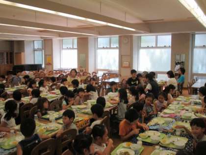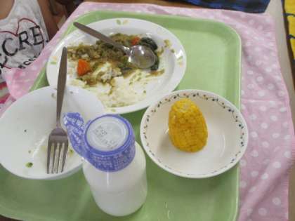 今日は1年生は、ランチルームで給食をとりました。1時間目に生活科の授業で、とうもろこしの皮むきをしたので、今日の給食は格別においしくいただけたようです。たくさんおかわりをして、大満足の1日でした。
