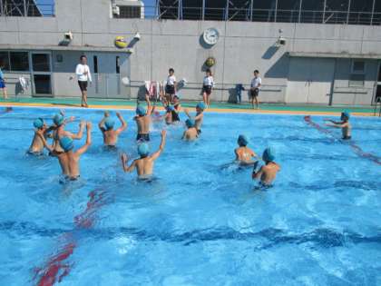 絶好の夏晴れの下、球技クラブはプールで「水球」を行いました。普段の水泳指導とは違い、水の中での球技に、最初子どもたちは大はしゃぎでしたが、きちんと先生の指示に従って、安全に気をつけながら、ルールを守って取り組みました。支援員の天野先生にも加わっていただき、思い出に残る1学期最後のクラブ活動の1コマでした。