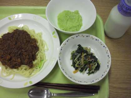 1学期最後の給食は本格仕立ての「ジャージャー麺」です。八丁味噌や豆板醤を使って本格的な味付けです。デザートは宮城県の郷土料理「ずんだもち」です。枝豆を茹でてミキサーにかけ、砂糖と練乳、少量の塩で餡をつくり白玉餅と一緒にいただきます。鮮やかな色あいの一品になりました。