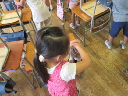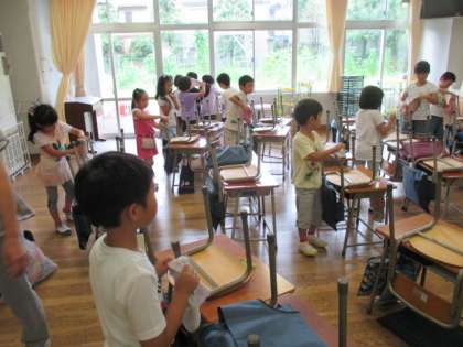 1年生は、夏休みを前に自分たちの教室の掃除、特に自分の使った机やいすの脚をきれいにしていました。それぞれの脚の裏には、この3カ月でたくさんのゴミがこびりついています。それらを、雑巾で一つずつ丁寧に拭き取ります。授業でお世話になった道具をきれいにして、気分よく2学期を迎えられるように、全員がんばっていました。さらに各クラスで、21日から始まる夏休みの水泳指導の際の受付の仕方を練習しました。八幡山小学校ではこの夏休み、16日間水泳指導があります。1学期は天気がよくなくて、あまりプールに入れませんでしたが、夏休みはぜひ皆勤を目指してほしいと思います。