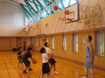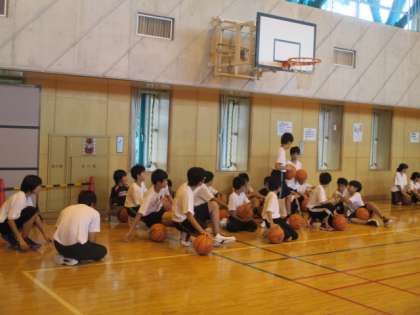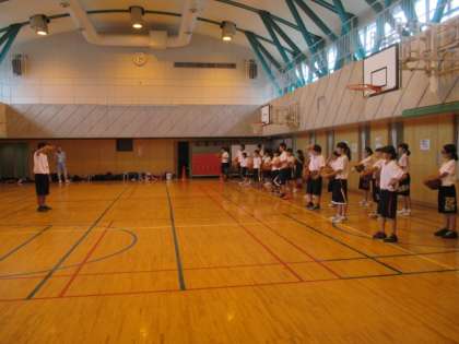 地域体育館では、緑丘中バスケ部顧問の先生・コーチ、そしてバスケ部員の先輩方、さらに特別ゲストに、八幡山駐在所の武藤さんをお招きしての、『チャレンジ☆バスケ』です。こちらも学年別の2部構成で行いました。男女約30名以上の中学生がいっしょに参加し、小学校の子どもたちにやさしく教えてくれていました。