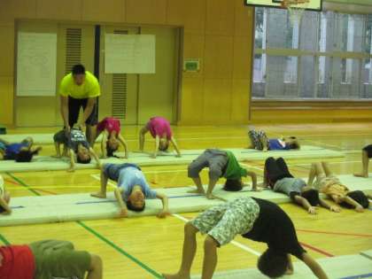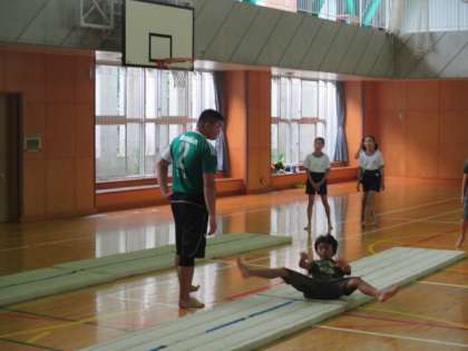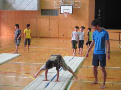 第1体育館では、本校教員で体育大好き・スポーツ万能の利根川教諭による、『楽しい体そうをしよう!』の講座が開催されました。学年別の2部構成で、器械体操の基礎を中心に、マットや跳び箱などを行いました。蒸し暑い体育館でしたが、先生の模範演技を見て、子どもたちも楽しく、気持ちのよい汗を流していました。