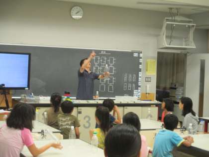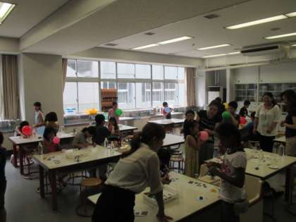 理科室では、本校の塚越主任教諭による『ちょっとふしぎなおもちゃを作ろう』というタイトルで、科学工作の講座が開かれました。身近にあるペットボトルを使った不思議なおもちゃを手始めに、実験的な活動を織り交えながら、楽しく活動していました。