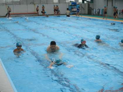 1回目は3・4年生。男子の参加者は女子の2倍で、朝から元気いっぱいです。でも、準備運動もきちんとやって、やる気満々でたくさん泳ぎました。課題別の練習では、平泳ぎの脚の練習を個別で教わったり、長い距離をひたすら泳いだり、それぞれがめあてをもって努力していました。