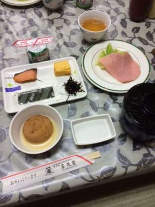 朝食の時間です。アツアツのみそ汁の香りが食欲をそそります。たくさん食べてハイキングがんばるぞ。