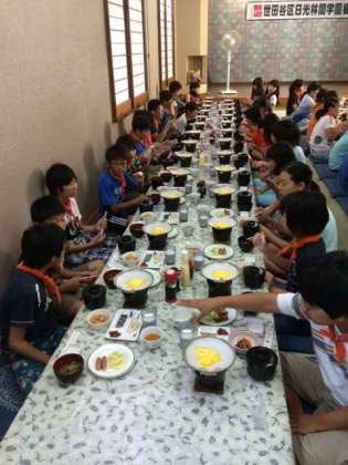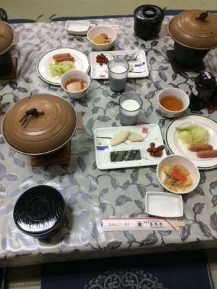 宿舎で食べる最後の食事です。寝ぼけまなこにみそ汁が染みます。味わっていただきます。