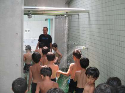 夏休みのプールでは、いつもは教わることのない先生や、夏休みだけの補助員の方々ともなかよしになります。特に低学年の子どもたちは、高学年や専科の先生にたくさん関わることができ、笑顔いっぱいでした。でも、ちょっと元気すぎて、シャワーで叱られてもいました。