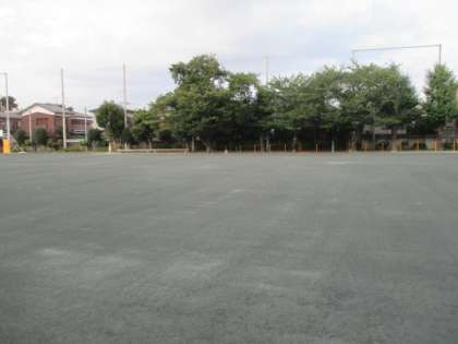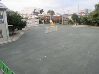 先週から本格的に始まった校庭の改修工事がほぼ終了し、きれいになりました。後は検査を受けて、防護柵の撤去をするだけです。来週から使用が可能になる予定です。