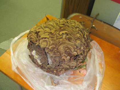 本校でお世話になっている造園工事の方が、近隣で発見された大きなハチの巣をもってきてくれました。子どもたちの学習に使ってくださいとのことでした。八幡山小学校の周辺には、自然がたくさんあるということですが、とても大きな巣なのでちょっとびっくりです。玄関のところにしばらく展示しておきますので、観察してみてください。