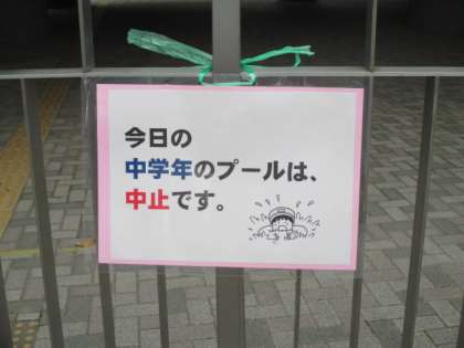 気温が低いため、1回目の中学年の水泳指導は中止になります。2回目は、9時20分をめどに判断しますので、お待ちください。正門に掲示をします。