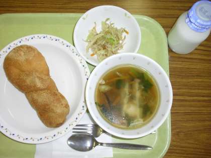 「きな粉揚げパン、春雨スープ、野菜の中華風味、牛乳」です。